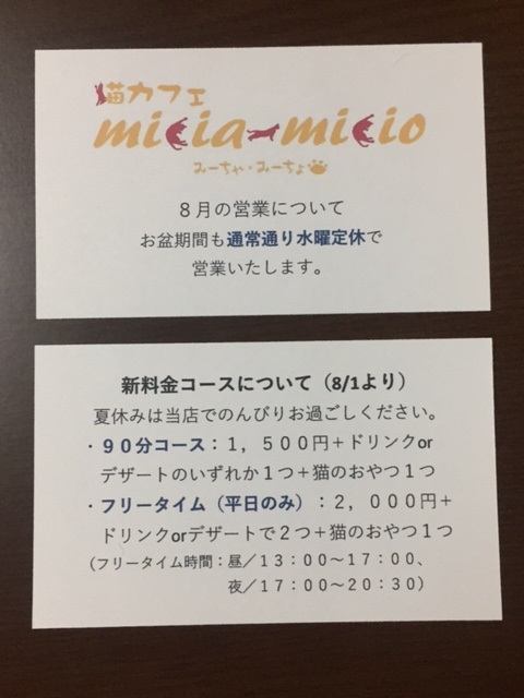 お盆期間も通常通り水曜定休で営業いたします。また夏休みをゆっくり猫ちゃんと過ごしていただきたく長時間コースを作りました。